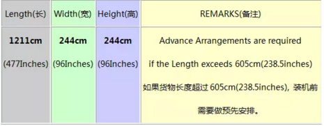 此外注意605cm為20英尺板的長度,如果貨物超過605cm長度,在裝飛機(jī)時需要做預(yù)先準(zhǔn)備和安排,并從鼻(機(jī)頭)門進(jìn)入飛機(jī)貨艙貨物的一般長度限制為1211cm(等于兩個20英尺板相加的長度);超過1211cm的貨物不是不能裝入,但限制高度244CM應(yīng)該需要降低,需要做墊板操作才能裝入貨機(jī)。