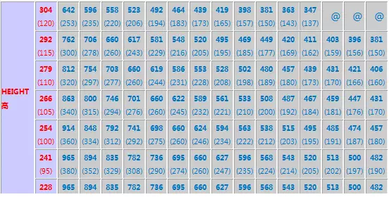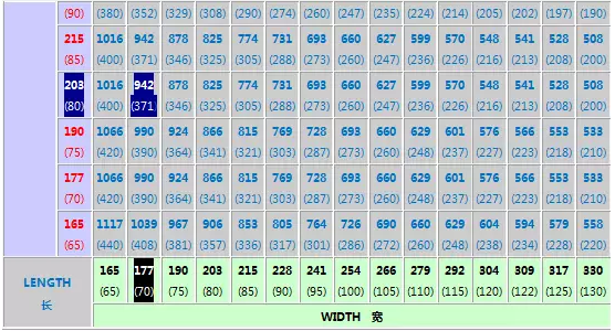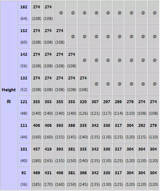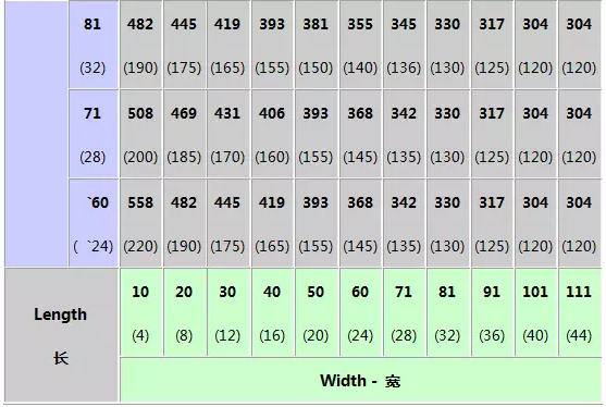 左側(cè)紅色字體藕荷色背景數(shù)據(jù)代表貨物高度,右側(cè)藍(lán)色字體灰色背景數(shù)據(jù)代表貨物長度,底部黑色字體綠色背景數(shù)據(jù)代表貨物寬度,每個格的上部數(shù)字為厘米(cm),下部數(shù)據(jù)為對應(yīng)折算的英寸(Inch);