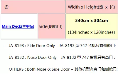 大家可以將超大件貨物長寬高三維的任意兩個維度尺寸代入到以上表格中,看代入得兩個維度尺寸交叉點對應(yīng)的第三個維度尺寸是否超過實際貨物的第三個維度尺寸,如果超過此貨物將無法裝入側(cè)艙門貨機(jī)中;