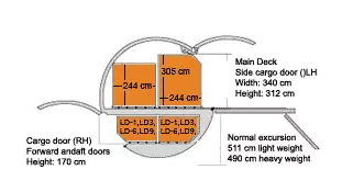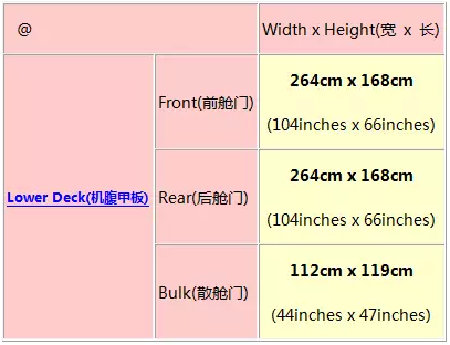 值得注意的是,機(jī)頭開口的實際尺寸為264cm(寬)x 248cm(高),但考慮到實際推入貨物到飛機(jī)機(jī)艙時航空公司都要求貨物兩側(cè)和頂部要和機(jī)艙門框保持合理距離,避免貨物剮蹭機(jī)頭造成安全隱患,并主要類型航空運輸集裝器的寬度為244cm,所以從鼻(機(jī)頭)門進(jìn)入飛機(jī)的貨物尺寸高度和寬度被限定為244cm;