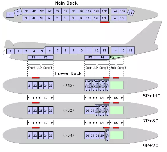 1) 以下圖片的第一張圖片是描述飛機(jī)主貨艙集裝器放置的俯視圖;第二張圖片是描述飛機(jī)主貨艙和機(jī)腹貨艙裝貨的縱切圖;第三到第五張圖片是說明腹倉裝集裝器的俯視圖;