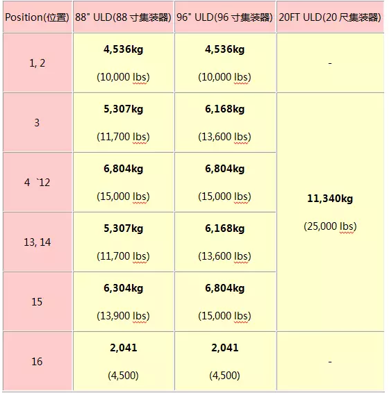 2) 從上面的第二張圖片可以看到主貨艙安置集裝器的位置,從1到16排開,下面的表格說明每個空運集裝器可以最多放多重的貨物: