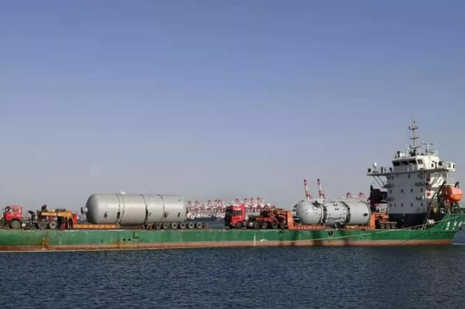 該公司結(jié)合駁船運(yùn)輸及作業(yè)特點(diǎn),利用牽引車將平板車上的3件設(shè)備從駁船上卸至碼頭,然后將另外2件設(shè)備移至駁船上,一次性成功作業(yè)5件化工反應(yīng)器罐體,這是營(yíng)口港區(qū)首次實(shí)現(xiàn)大件設(shè)備“滾裝滾卸”,也創(chuàng)下了單船裝卸大件數(shù)量新紀(jì)錄。